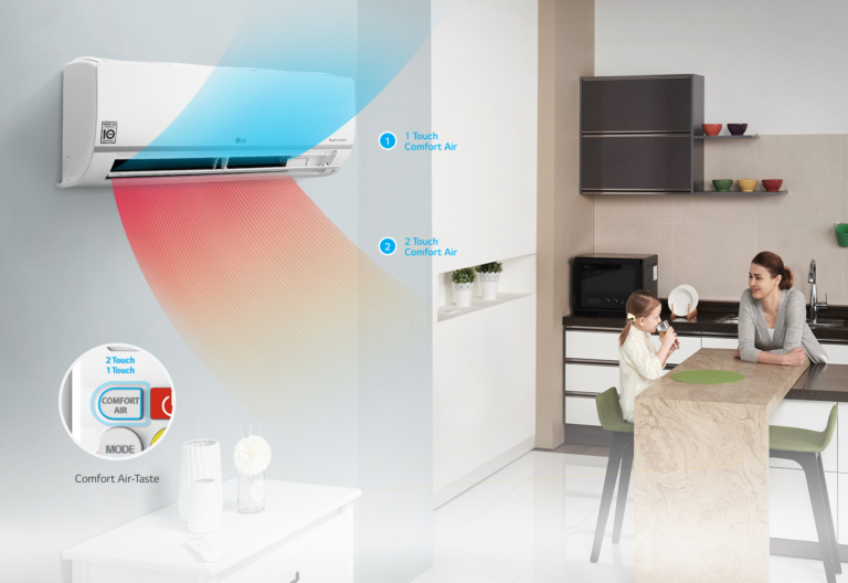 Über motorisch betriebene Luftleitlamellen. Auto Swing-Funktion für optimale Luftverteilung, automatisch Einstellung der Ausblasrichtung nach gewählter Funktion oder manuell über Fernbedienung horizontal in sechs und vertikal in fünf Stufen. Vier-Wege- Luftverteilung zur vollständigen Luftverteilung im Raum unabhängig vom Montageort des Klimagerätes.