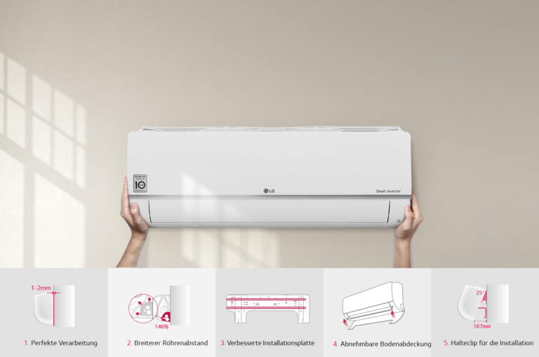 LG Standard Pro Single Set mit 6,6 kW Kühlleistung, leisem BLDC-Lüfter, 4-Wege-Luftverteilung, waschbarem Filter, Wi-Fi-Steuerung via App und Infrarot-Fernbedienung für hohen Komfort.